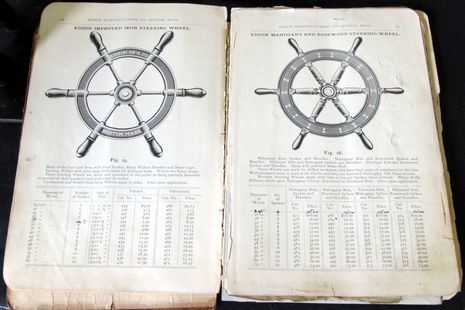 I visited Edson Marine headquarters while Gizmo was in New Bedford, Massachusetts, during my cruise home in May 2013, and one vivid memory is this old catalog that co-owner Will Keene showed me. My old sloop Alice had one of those Mahogany Steering Wheels, and while I’m sure it cost more in 1946, it’s amazing to realize that you could once buy one for $15, Ebonized Rim included. I also enjoyed seeing how well Edson has kept on keeping on since Jacob Edson invented and started manufacturing the first diaphragm pump in 1859…
