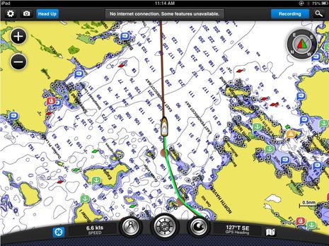 Yesterday I enjoyed a few hours on Lake Winnipesaukee, New Hampshire, aboard a Boston Whaler 280 Outrage recently fitted out as a Raymarine demo boat. Much of what I first saw introduced in Miami last February is now shipping and working in impressive ways. Note, for instance, how the “low end” Dragonfly sonar/plotter is holding bottom in DownVision mode at more than 75 feet and 28 knots. And if it weren’t for the camera-exaggerated glare you could also see how bright and sharp the “high end” gS125 Glass Bridge display was looking. I became particularly enamored of the new RMK-9 keypad that gave us hybrid-style control of not just the gS but also the two a6x MFDs…