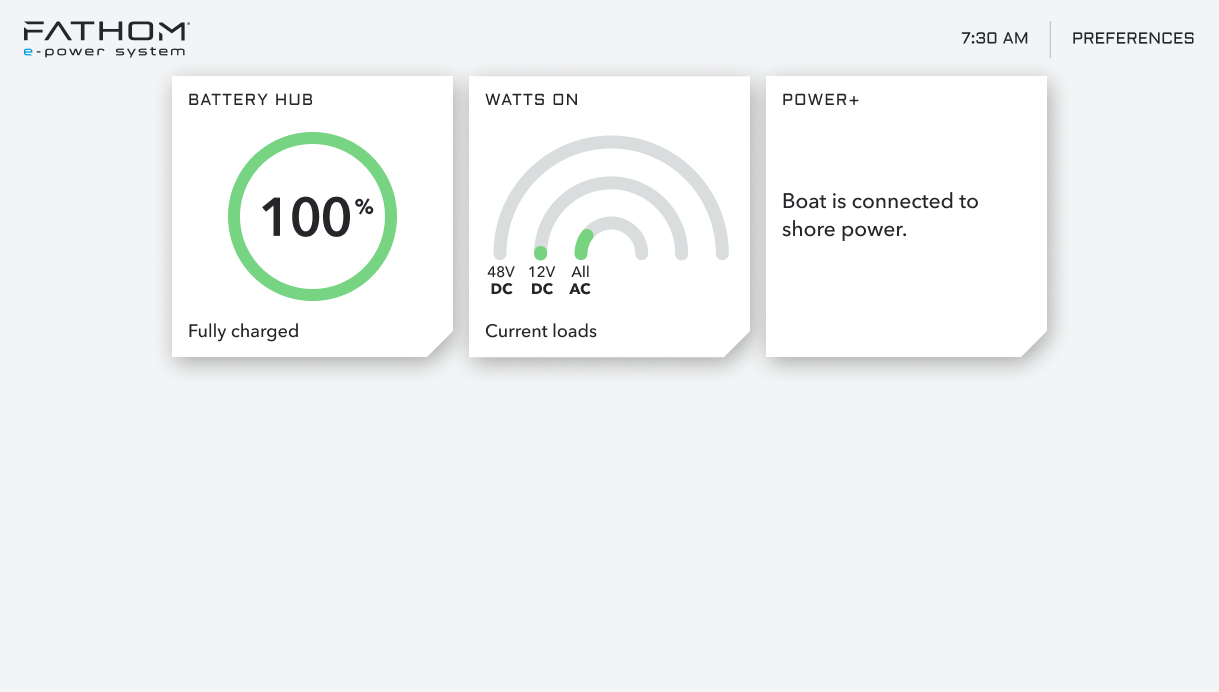 The gallery above shows a day in the life of a Fathom e-Power system through the user interface. The day starts with the boat plugged into shore power and fully charged. At 7:30 am the boat fires up and pulls off the dock. The boat motors to an anchorage, drops the hook and shuts off the engines. There’s enough battery to run the boat’s air conditioning, refrigeration, stereo, and other house loads until mid-afternoon. At that point, the operator is prompted to start the engines, and charging begins. Initially, charging is in extend mode, charging at 3 kilowatts per engine. After charging for a while, the operator changes the charge mode to boost, and charging finishes within 45 minutes. The engines then stop automatically and the batteries return to carrying the electrical loads.